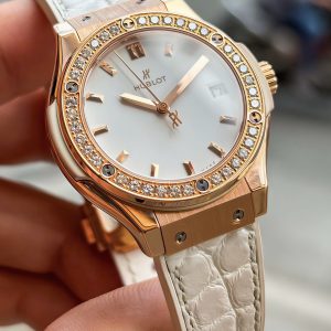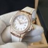 Đặt mua Hublot Classic Fusion MOP White Diamonds Nữ, Ref: 581.OE.2080.LR.1204, Vàng hồng đúc 18k nguyên khối, Niềng Kim Cương Thiên Nhiên Zin hãng, Size 33mm, Like new fullbox